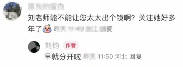 可就当网友问起相干妻子时,刘钧却说两东谈主也曾分开很深切。