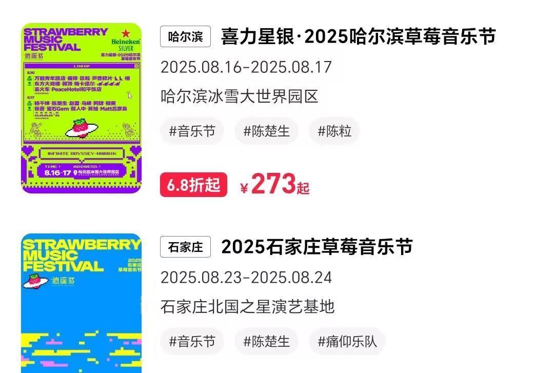 再看音乐节方面,当今笔者这边搜到的,陈楚生加盟的拼盘音乐节折柳是哈尔滨草莓音乐节和石家庄草莓音乐节,而当今两场演唱会并不存在几许溢价。