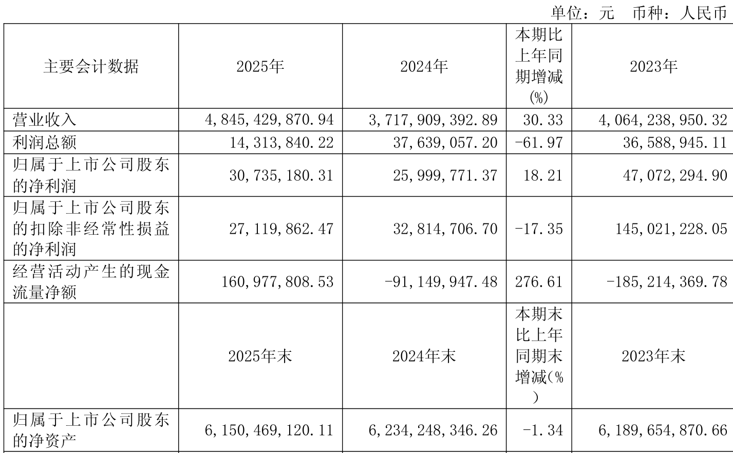 中证智能财讯鼎盛缔造(600512)4月18日裸露2025年年度解说。2025年,公司达成交易总收入48.45亿元,同比增长30.33%;归母净利润3073.52万元,同比增长18.21%;扣非净利润2711.99万元,同比下落17.35%;琢磨举止产生的现款流量净额为1.61亿元,上年同时为-9114.99万元;解说期内,鼎盛缔造基本每股收益为0.02元,加权平均净财富收益率为0.50%。公司2025年度分派预案为:拟向整体激动每10股派现0.1元(含税)。
