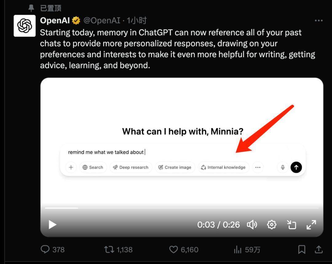 在不雅看官方发布的先容Memory功能的视频里,我发现他们演示的对话窗口下,是有一个Internal Knowledge按钮的,就排在Deep research (2月初上线)和create image(3月底上线)的后头。